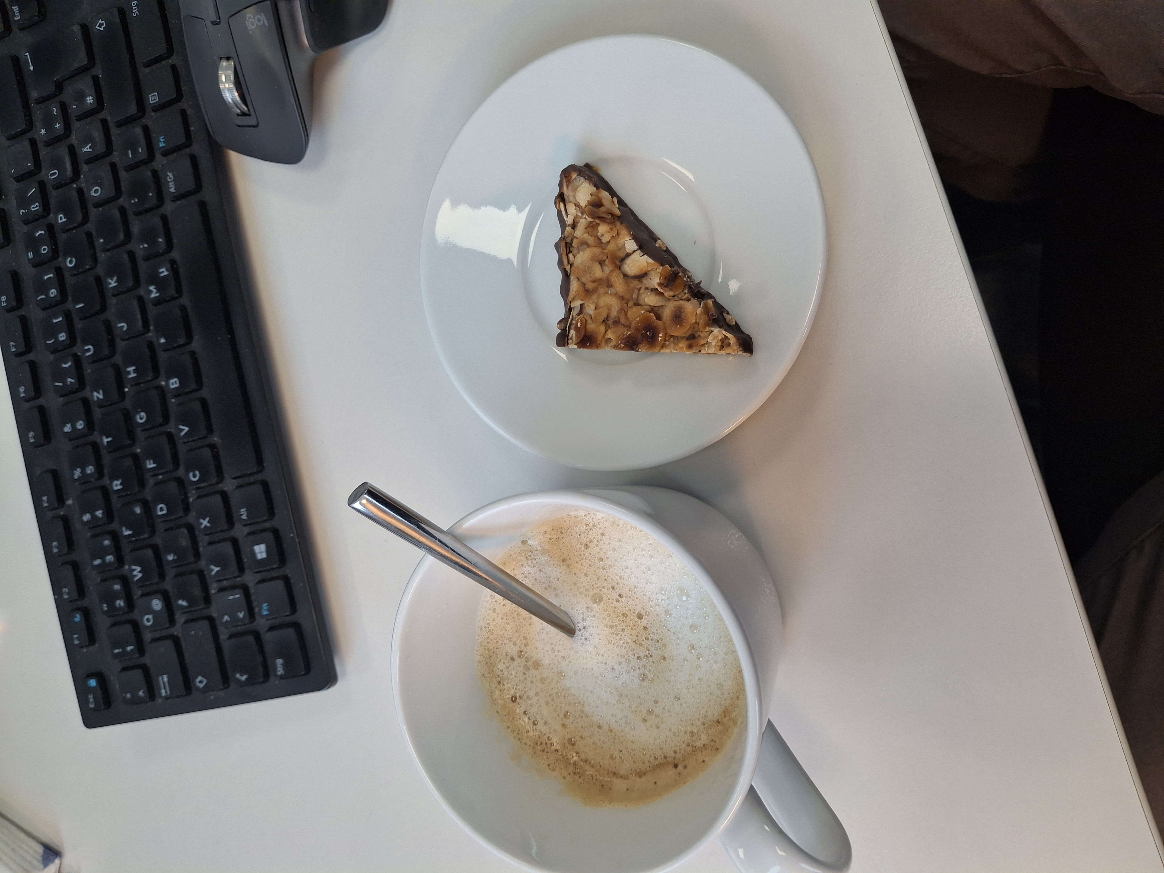 The 2 o'clock coffee, it's a new thing I am trying. Helps bridge the time between lunch and the 4 o'clock cigarette and subsequent coffee. Today I am indulging in a leftover Nussecke, a very popular German pastrie B)